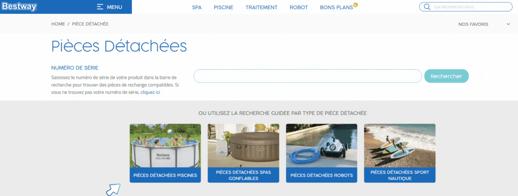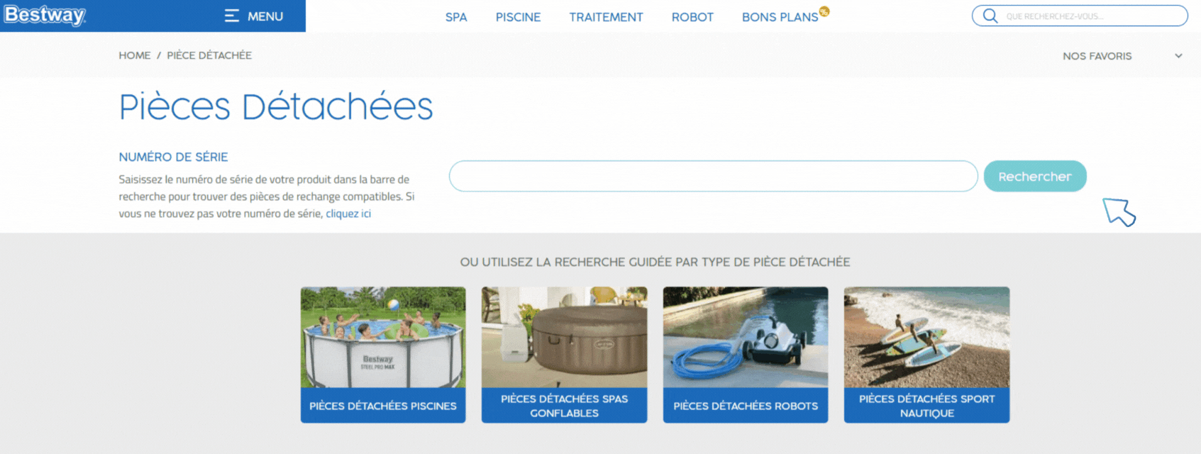 Avant de débuter votre recherche, chercher le numéro de série sur votre produit Bestway. Pour savoir où trouver le numéro de série, consultez ce guide. Vous trouverez un schéma explicatif pour chaque type de produits.